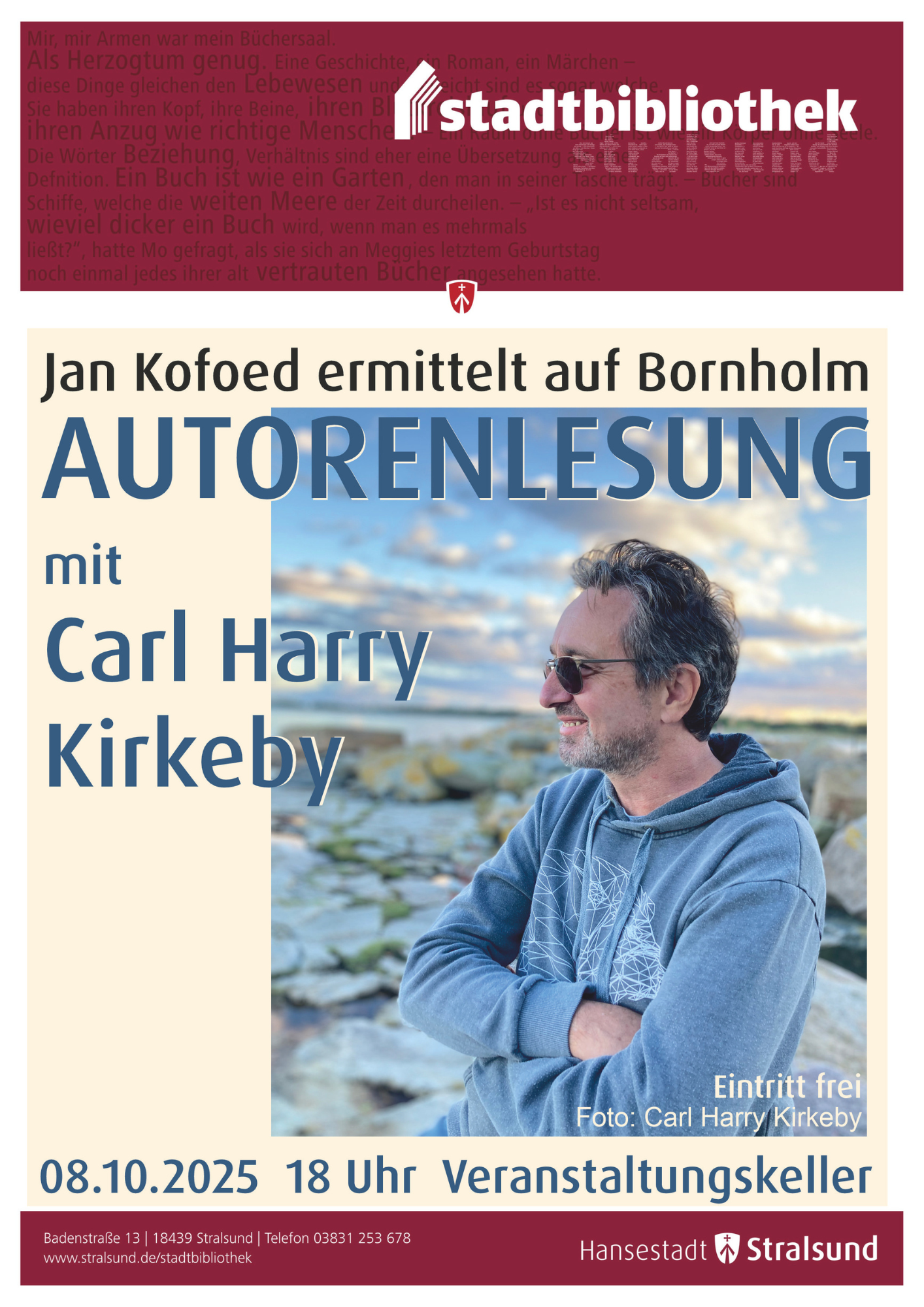 Am 8. Oktober 2025 las ich in den stimmungsvollen Kellerräumen der Stralsunder Stadtbibliothek. Aufgrund des wirklich ungemütlichen Wetters hatten sich nur 20 Interessierte eingefunden. Das tat der guten Stimmung aber keinen Abbruch, es gab intensiven Austausch und Nachfragen. Ein wunderbar von Frau Eisfeld organisierter Abend.
