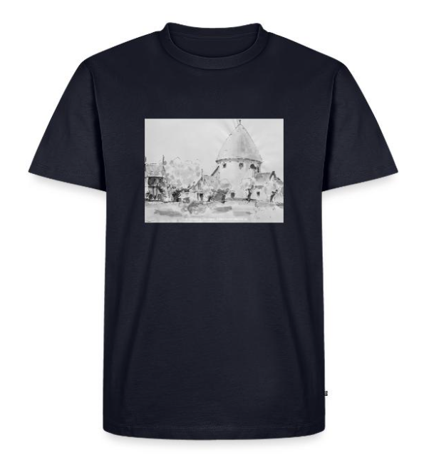Das schwarze T-Shirt zeigt den Hafen von Snogebæk, das rote eine Räucherei, vermutlich auch in Snogebæk. Und das Bild ganz rechts die Ols Kirche. Alle gemalt oder gezeichnet von Fritz Scherping (1930-2019).