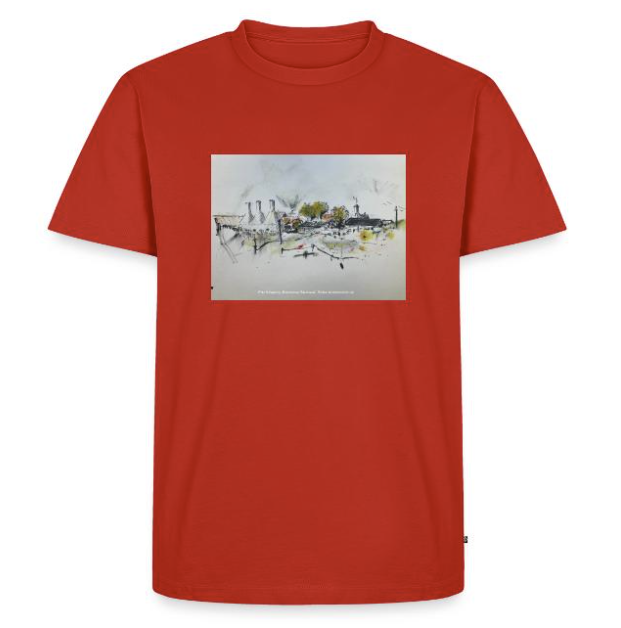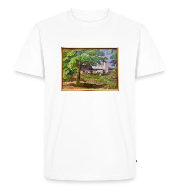 Das weiße Shirt zeigt eine Bornholmerr Räucherei, vermutlich in Svaneke, gemalt von Kræsten Iversen (1886-1955)
